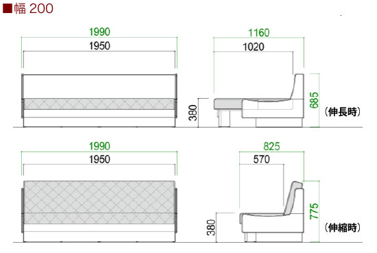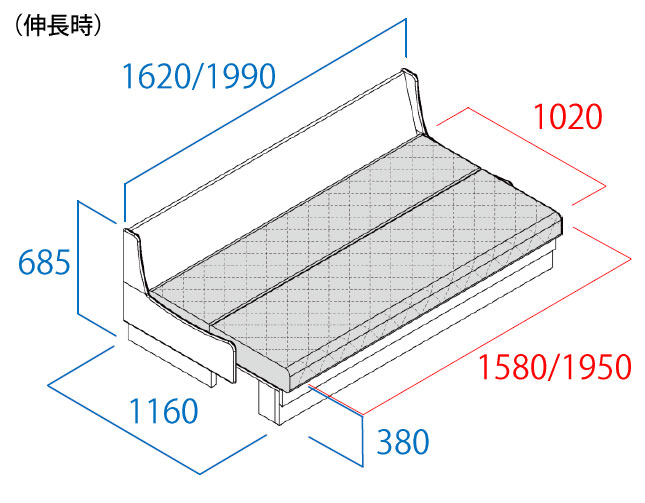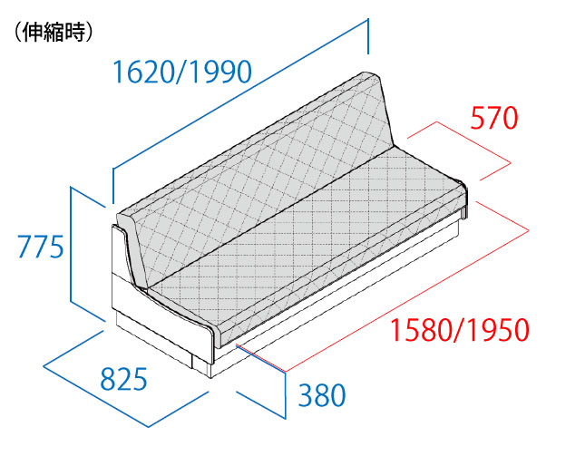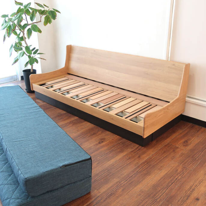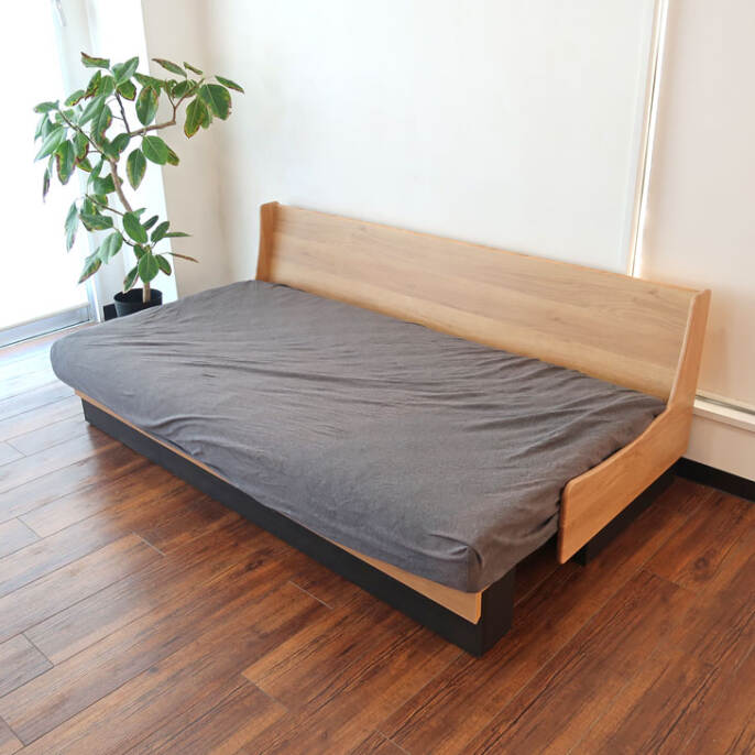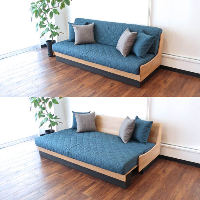 従来のソファベットとは少し違った構造になっています。従来の形は壁に対して少し前に設置しないといけなかった(背を倒す為)ので無駄なスペースがどうしてもできやすかった難点がありました。こちらのタイプは前に引っ張って出すので普段ソファタイプにしておくときはピッタリ背中に付けて使用できます。